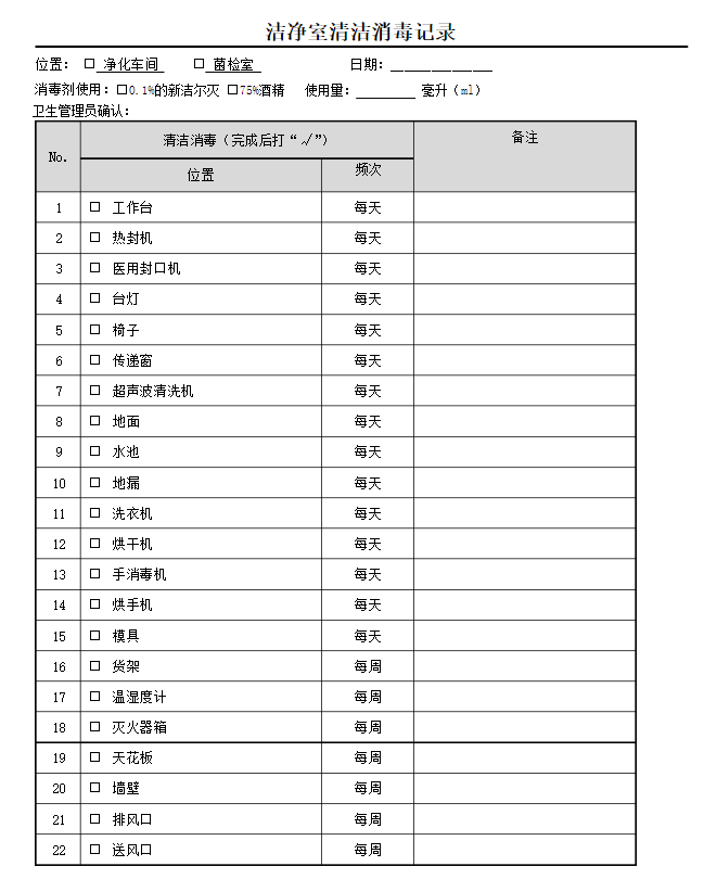 凈化車(chē)間需要有很多的表格,比如消毒、清潔等,每天都必須有人簽到以及主管部門(mén)確認(rèn),這樣才能保證干凈,洗手消毒記錄表怎么做呢?下面中凈環(huán)境來(lái)詳細(xì)分享做法。